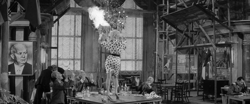 Politik ist dazu da, parodiert zu werden. Aber EINS, ZWEI, DREI ist nicht von der langsamen Sorte, sondern ein Witz-Maschinengewehr. Es werden keine Pausen gemacht und schon gar nicht für geschichtspolitische oder gar kulturelle Referenzen im Drehbuch. Es ist bemerkenswert, wie der in Österreich geborene Billy Wilder einen so treffsicheren Film in Westberlin drehen konnte, aber auch das damalige Leben gekonnt aufs Korn nimmt. Ja richtig gehört, es wurde direkt in West-Berlin gedreht und ein paar Monate später stand bereits die Berliner Mauer. Das Brandenburger Tor war schon im Grenzumbau und so musste das Drehteam doch noch aufs Filmgelände in München ausweichen, wo ein kleineres Tor nachgebaut wurde. Einzig die Hangar-Szene auf dem Tempelhofer Flughafen wurde in einem Hollywood-Studio gedreht.