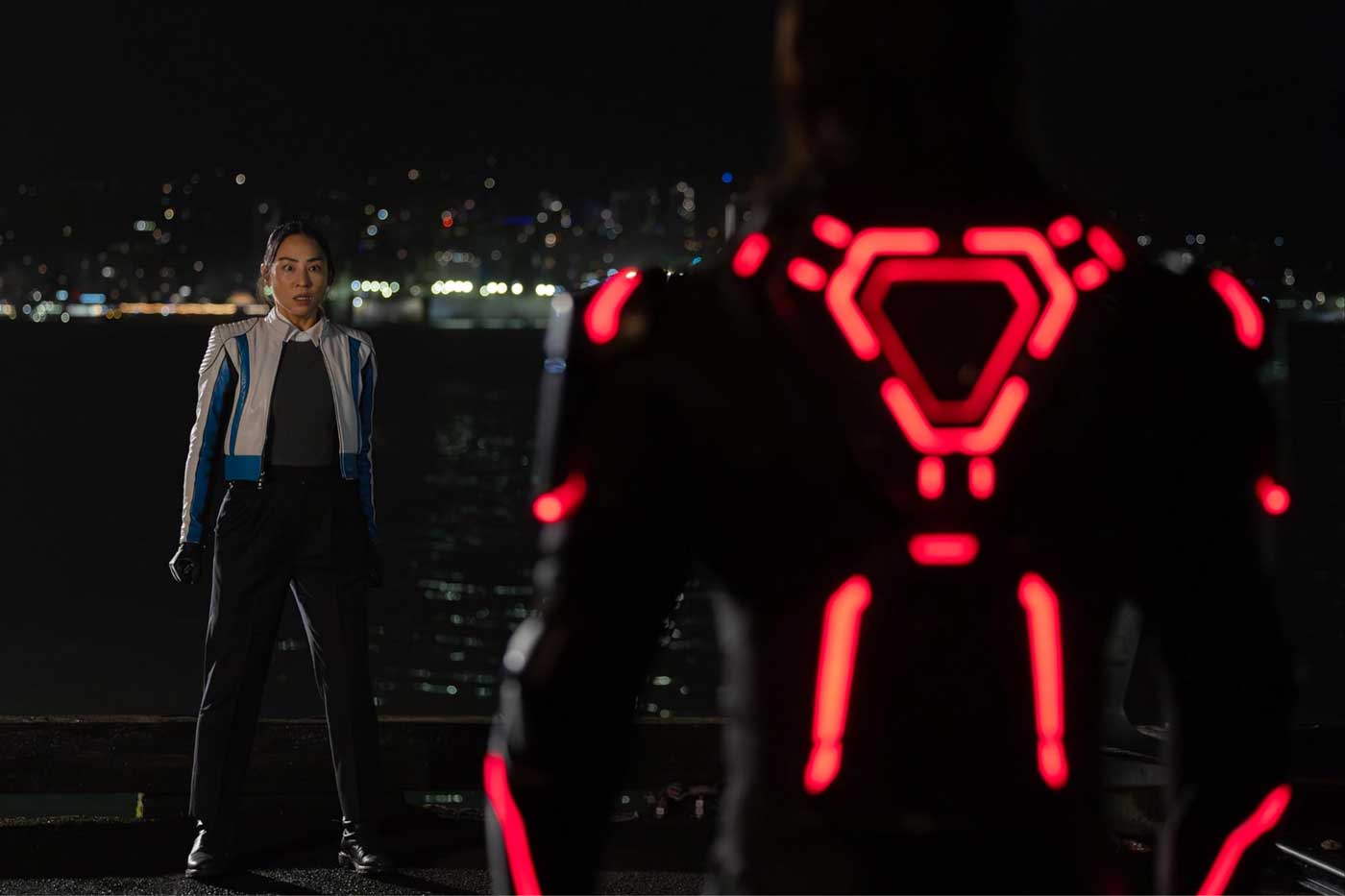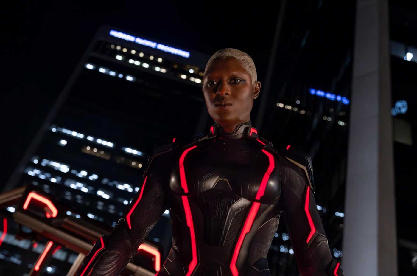 Der junge IT-Schurke mit krassen Tattoos, aber nie enden wollender Suche nach Anerkennung der Mutter (Gillian Anderson) lässt sich bei keiner Minute ernst nehmen. Eve Kim, die von Greta Lee gespielt wird, welche sich mit PAST LIVES einen kleinen Fensterplatz im Filmherzen gesichert hat, ist die gute Techmilliardärin, kommt aber auch etwas steif daher. Zum Glück hat sie Arturo Castro dabei, der ihren Lebenspartner Seth Flores spielt und der etwas Leben in diese steife Science-Fiction-Frankenstein-Nummer bringt. Hauptfigur ist der Supersoldat Ares, der durch Schmerzen, fehlende Anerkennung seines Codierers und das Erkennen von Mitgefühl bei anderen Menschen eine Kehrtwende macht. Vom Zerstörer zu Beschützer in drei Neustarts. Das klingt oberflächlich, ist es auch, selbst wenn sich Jared Leto alle Mühe im Prozess der Vermenschlichung gibt. Seine Schülerin wird dann auch noch zur Gegnerin. Schade um die tolle Jodie Turner-Smith als Athena.