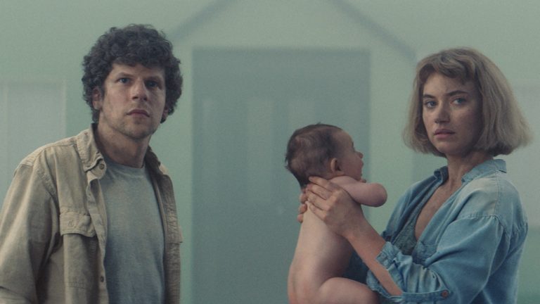 Imogen Poots und Jesse Eisenberg beweisen wieder einmal ihr Talent als Schauspieler. Für diese geniale Idee von Lorcan Finnegan und Garret Shanley treten sie sogar als Executive Producers auf. Auch wenn man VIVARIUM das niedrige Budget anmerkt, ist die einfache künstliche Umgebung mehr als dienlich. Ein Szenenbild der Unauffälligkeit, was bis ins kleinste Detail stimmig ist, macht die obskure Pappmaschee-Welt auf der Leinwand fast greifbar. Man schmeckt das künstliche Essen, riecht das große Nichts und fühlt die unwirkliche Welt. Im Drehbuch finden sich immer wieder Szenen, welche diese Stimmung stärken. Gemma und Tom fliehen ab und zu in ihr Auto, weil es sie an ihr Zuhause, die echte Welt erinnert, allein durch dessen Geruch. Tom gräbt sich durch einen wirren Mix aus Sand, Stein und Knetmasse, was den mühseligen Prozess zeigt und wie wenig es hier ein Vorankommen gibt. Aber auch das Fehlen von jeglicher Industriemarke, abgesehen von der Firma, der die Siedlung gehört, macht es jedem Zuschauer leicht in die bequemen, unmodischen Klamotten von Gemma und Tom zu schlüpfen. So ertappt man sich immer wieder selbst in diesen Musterhausräumen, gefangen mit einem absonderlichen Kind ohne jede Hoffnung auf ein eigenes Leben.