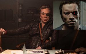 Ein wenig verwundert hat mich hingegen, was aus dem einst gefeierten Star Mickey Rourke (ANGEL HEART, 1987; SIN CITY 2: A DAME TO KILL FOR, 2014) geworden ist, und da beziehe ich mich ganz besonders auf sein Äußeres. Die Ähnlichkeit mit der Maske eines Arnold Schwarzenegger in der bekannten „Augen-Szene“ im Hotel aus TERMINATOR (1984) ist verblüffend (siehe Bild).
