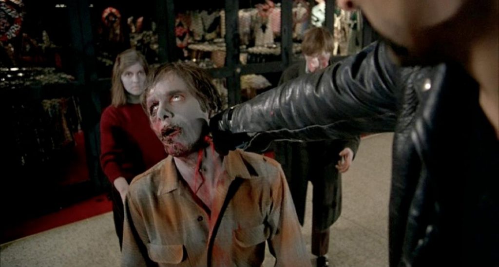Bei ZOMBIE bekommen wir diese Triebe gleich zu Beginn vor Augen geführt, wenn Polizisten ein Gebäude stürmen und keinen Unterschied zwischen Zombies und illegalen Einwanderern machen. Auch unsere vier Helden des Filmes sind nicht ganz frei von fragwürdiger Gewalt. Zu Beginn noch sichtlich gehemmt in der Benutzung ihrer Schusswaffen und dem Töten der Zombies, fällt ihnen im Verlauf des Films genau das immer leichter und wird bald zum großen Spaß. Genau die gleiche Art von Spaß, den sich später im Film auch die Rockerbande gönnt, wenn sie die „Shopping Mall“ stürmen.